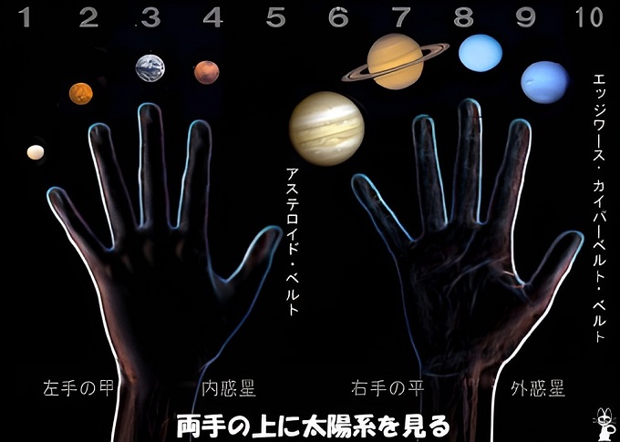 ■1■4つの地球型内惑星の水星・金星・地球・火星のすぐ外には小惑星帯があり、4つの木星型外惑星の木星・土星・天王星・海王星のさらに外にはエッジワース・カイパーベルトがある。私たちが10進法を用いているのは手の指が10本あるからだと言われる。片手を見れば、半分の5進法が内包されている。
