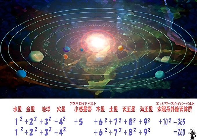 ■5■太陽〜アステロイドベルトの平均距離は2.721AUであり、アステロイドベルト〜海王星軌道の距離は27.336AUなので、実際にほぼ10進法的なホロンになっていることが分かる。また太陽〜木星軌道上のトロヤ群は5.2AUで、太陽〜カイパーベルト外縁が約50AUだから、こちらも10進法ホロンとなっている。
