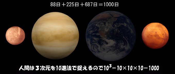 ■13■地球から見るということは、地球の1年や1日や1天文単位を基本の数値として、数え見るということだ。地球が自転すれば1日であり、太陽の周りを公転すれば1太陽年であり、地球から見て月相を一巡りしたら1朔望周期である。では先ずこれらの基本単位をもって、内惑星の公転周期を見てみよう。
