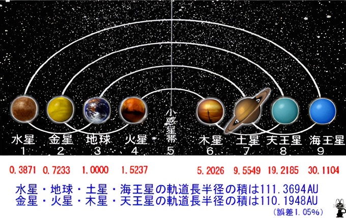 ■4■有効桁数を小数点以下4桁、軌道長半径の単位は天文単位(AU)として計算すると、水星・地球・土星・海王星の軌道長半径の積は111.3694AUとなる。そして金星・火星・木星・天王星の軌道長半径の積は110.1948AUだ。誤差わずか1.05%なので、これはほとんど同じであると捉えても良い近似値であろう。