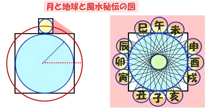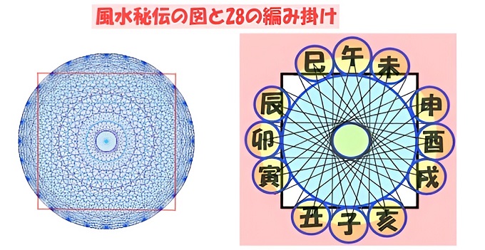 ■29■十二支が入っている月の大きさと等しい小円は、28芒星の頂点間を半径としているので、正方形の角を無視してぴったり詰めれば、地球の周長に14個並ぶことになる。なおこの28芒星の中心にできる小円もまた月の大きさと等しいので、この図の十二支対応の12個と、+1の13個の小円(月)とも対応する。