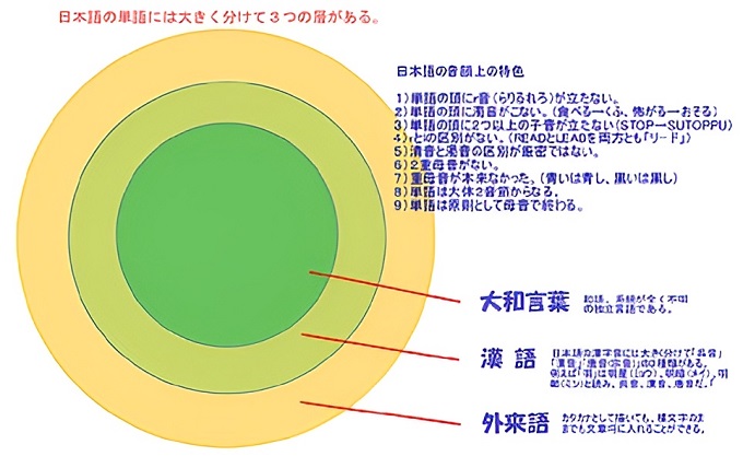 ■1■日本語の語彙には大きく分けて3つの層がある。先ずは大和言葉といわれる和語が中心にあり、基層には日本に古来より存在した和語があり、その外側を3世紀ごろから中国から取り入れられた漢語が厚く取り巻き、一番外側を西洋系の言葉(インド・ヨーロッパ語族)からなる外来語が取り巻いている。