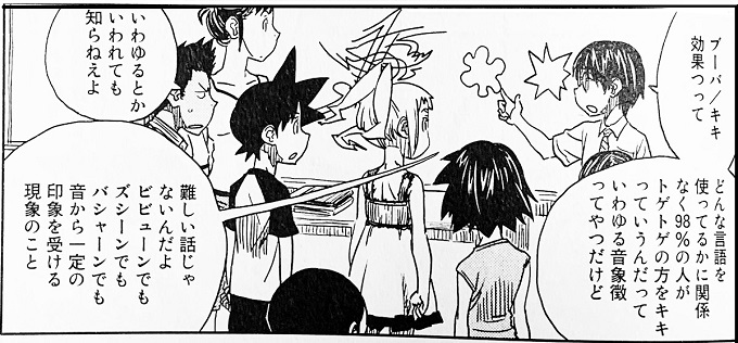 ■11■オノマトペに対する敏感さは日本語話者の特徴的傾向と言えるが、それは欧米言語話者や他国人と比べれば言語間差異として理解されないものなのだろか。認知心理学や言語学から「音象徴」と呼ばれる現象が提示されている。オノマトペは通常の語彙よりも知覚内容に近い意味をもち直観的に分かり易い。