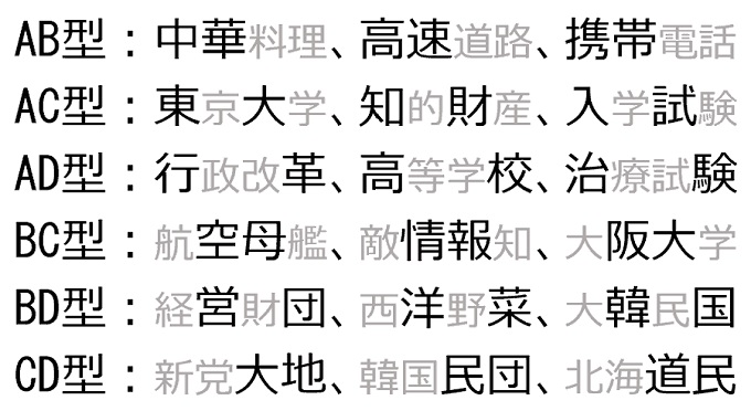 ■3■学割、特盛、外タレ、ラジカセ、カラオケ、カーナビ、スポニチ、ハイオク、ハイテク、ハイレグ、クロカン、デパチカ、デジカメ、ドラクエ、イケメン、アメブロ、メルアド、タダトモ、オシカツ…いくらでも上げられる。しかも短期限定の流行ではなく、初見でも見当がつき、みな同じ意味として共有できる言葉なのだ。