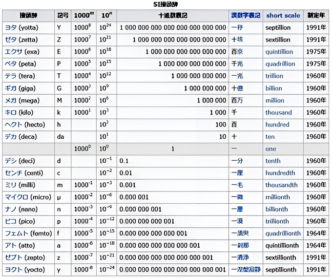 ■国際単位系で整備された接頭語の表をwikipediaより借用したので、それと比べてみると和洋の差異が分かるだろう。万国共通を理念としたメートル法も、桁数の区切り方は3桁ごとになっている。一万は十×千で10,000=ten