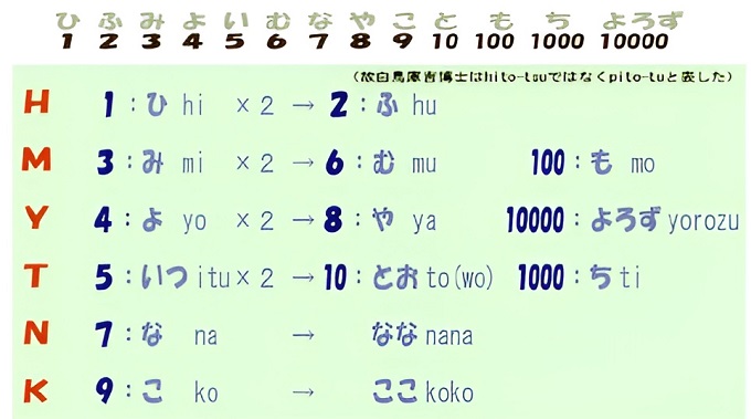 ■10■大和言葉の数詞は1〜10の「ひ、ふ、み、よ、い、む、な、や、こ、と」の後ろに「も、ち、よろず」と続き、「も」は百で「ち」は千、そして「よろず」は万を表している。位取りで言うならば一、十、百、千、万の5桁だ。現代日本語は5母音と13子音から成るが、和語の数詞は1万までの5桁の数を13個の数詞で表現している。