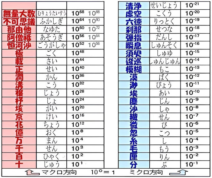 ■14■日本で大きな数の単位が現在のように確立したのは、江戸時代に吉田光由の著した『塵劫記』において、万進のみで統一された年寛永11(1634)年版からだ。元は仏教用語だが、大きな数の桁数の名前は4桁ごとには万、億、兆、京、垓、杼、穰、溝、澗、正、載、極と続く。この時点で1の後に0が48個も並んでいる。